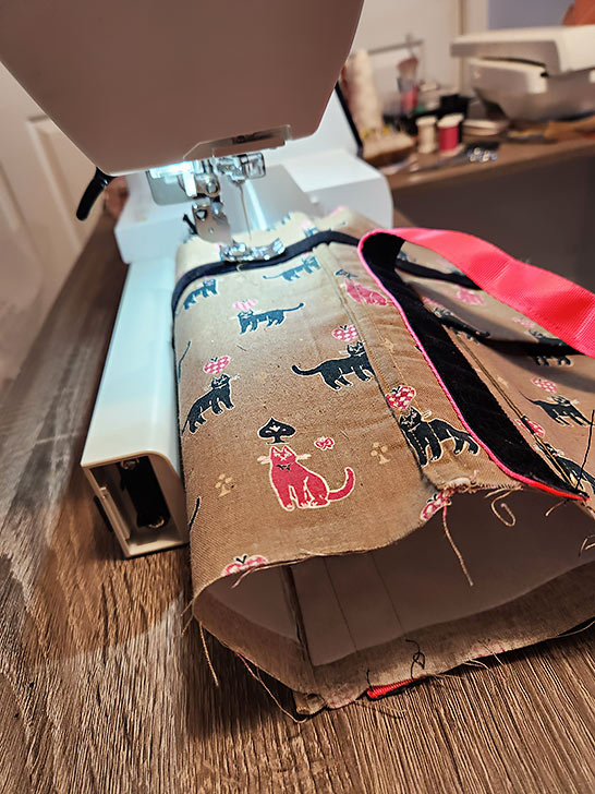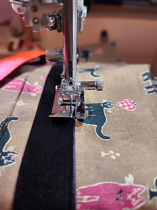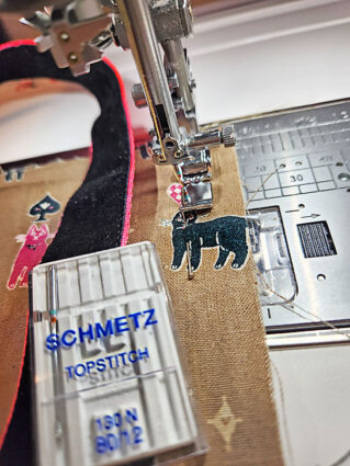 - The machine should still be threaded with thread to best match the ribbon in the top. You could leave the thread that matched the webbing in the bobbin or switch to a bobbin full of thread that matches the exterior panel. It doesn’t really matter as the bobbin thread will be hidden by the lining. Keep the slightly lengthened stitch.