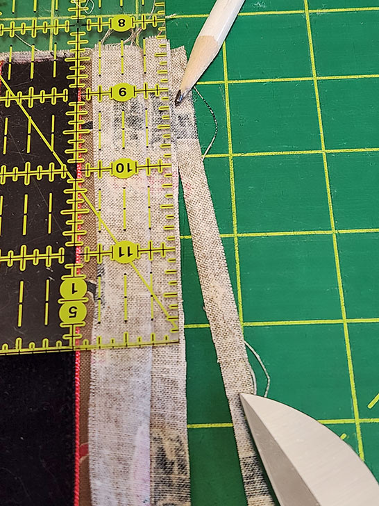 - Find the 2” x 30” bias strip. If you had to cut more than one 2” strip to get to the full length, seam them together now to equal the 30”.