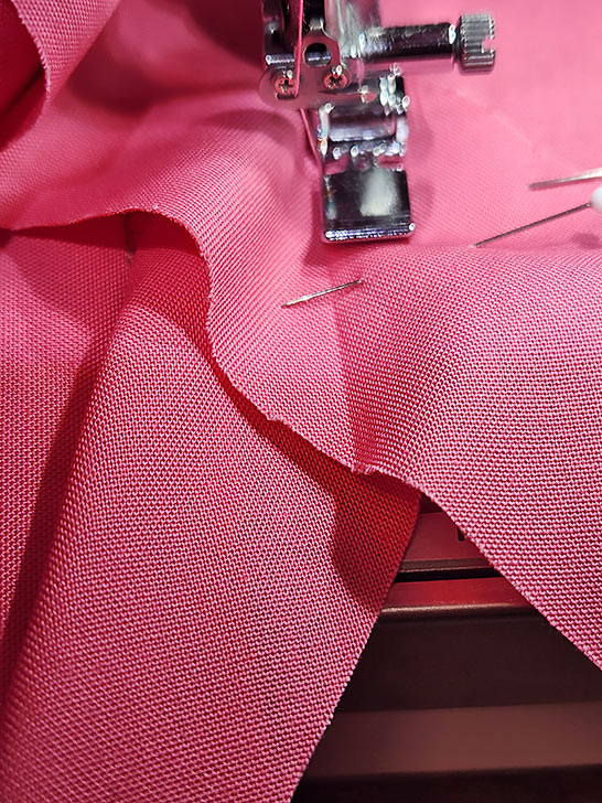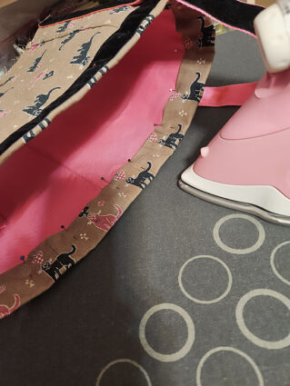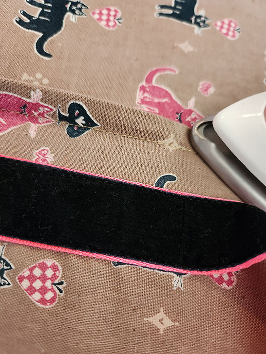 - Pin the handle in place along both sides from the bottom up, stopping 3½” from the top raw edge of the panel.