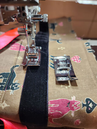 - Time once again for our trusty Bi-Level foot. We snapped on the Left Bi-Level foot, using it to run along the inner fold of the faux facing. It is very important this seam falls as close to the fold as possible in order to insure the front seam is an even ¼” below the bottom edge of the ribbon around the top of the bag.
