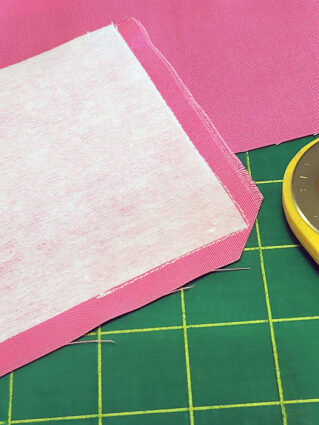 - Center a main interfacing panel on each fabric panel so there is ½” of fabric showing beyond the interfacing on all sides. Following manufacturer’s instructions, fuse in place.