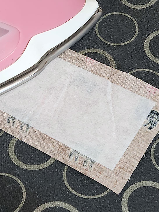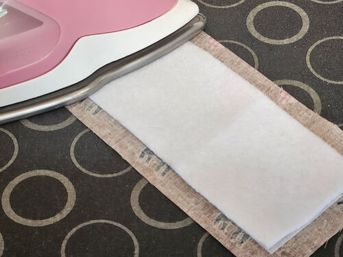 - Unfold and slip in the interfacing so it aligns along that center crease with ½” of fabric showing beyond the interfacing on the outer three sides. Following manufacturer’s instructions, fuse in place. The side of the pocket with the interfacing is the front of the pocket – the side facing out.