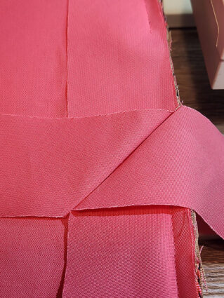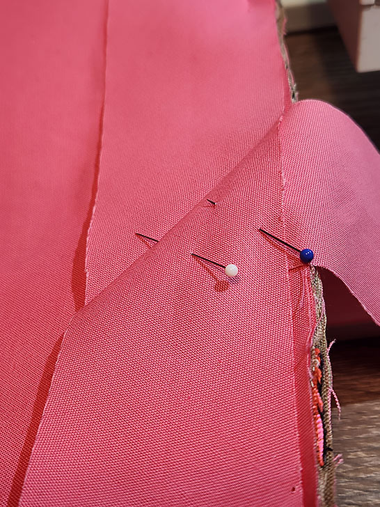- With both layers smooth and flat against one another, slip the top raw edge of the lining under the exterior faux facing; it should sit up against the top fold of the faux facing. Pin in place all around through all the layers.
