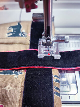 - If possible, now is the time to attach the amazing Janome Bi-Level foot to edgestitch the pocket to the base panel along both sides (the bottom raw edges of the pocket remain unsewn).