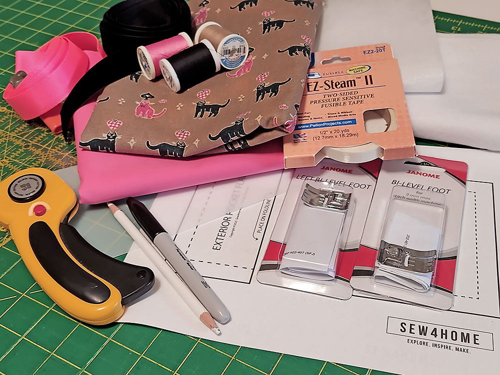 This stylish tote is smaller in size but with big design details. As you move through the step-by-step instructions below, you’ll see how we used the Bi-Level feet to create the flat felled seams that join the exterior panels, to attach the two-layer handles and the accent ribbon, to secure the pocket and pocket flap, and to get a perfect line of topstitching along the top facing.
