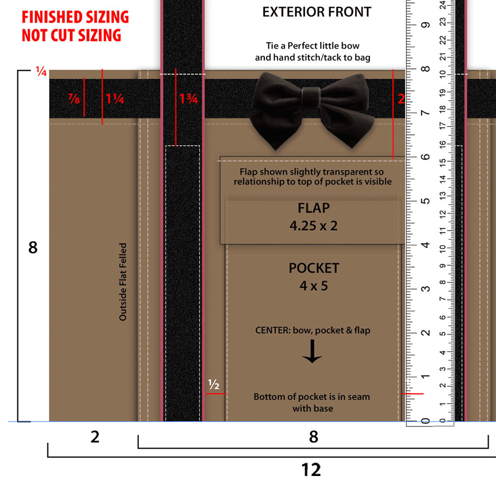 Using the pocket and flap patterns, but cutting on the dotted seam line rather than the solid outer line, cut ONE of each - From the velvet ribbon, cut THREE 30” lengths: two for the handles and one for the top accent. The remainder will be used for the final 3” bow.