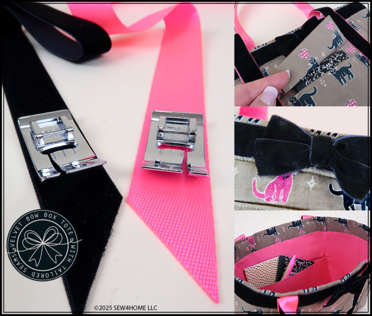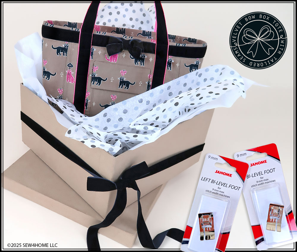Our favorite foot for this adorable box tote is actually two feet: the Left and Right Janome Bi-Level feet. These specialty feet are precisely engineered into two slightly different levels to accommodate the multiple fabric layers created by a seam, an overlaid element, like ribbon or webbing; and it also perfect for finishing non-seamed edges, such as around the top of a tote. By placing the foot along a seam (the slightly lower side against the edge), the split levels guide the foot along the seam, creating a consistent line of edgestitching or topstitching. When the Bi-Level foot first came on the scene in 2022, it was only available with the split level guide on the right side of the foot. Now, because Janome engineers listen to what their customers want, there is a left side version of the foot. We used both to complete this tote.