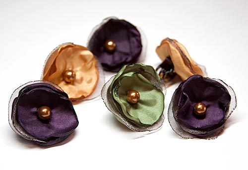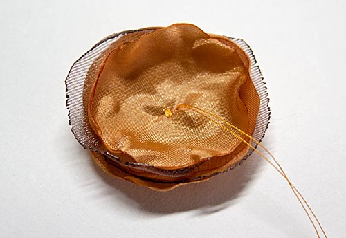 Cut 1¾”circles from your fabric. Use your imagination to get the look you want. We used three polyester lining fabric circles and two organza circles for each flower.