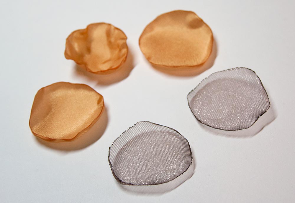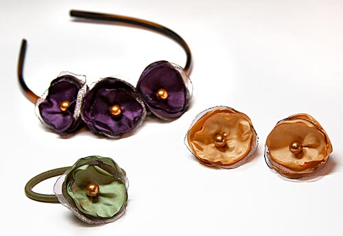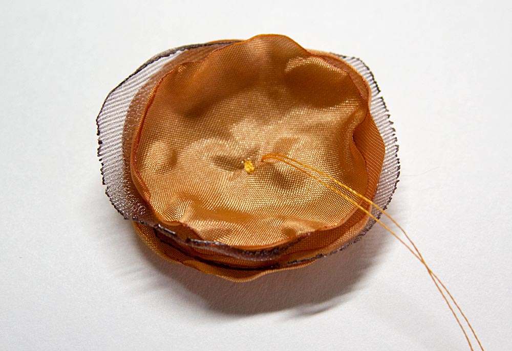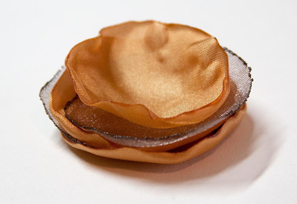 Following the Organza Flower Tutorial, lightly wilt the edges with a candle flame to approximate this look:
