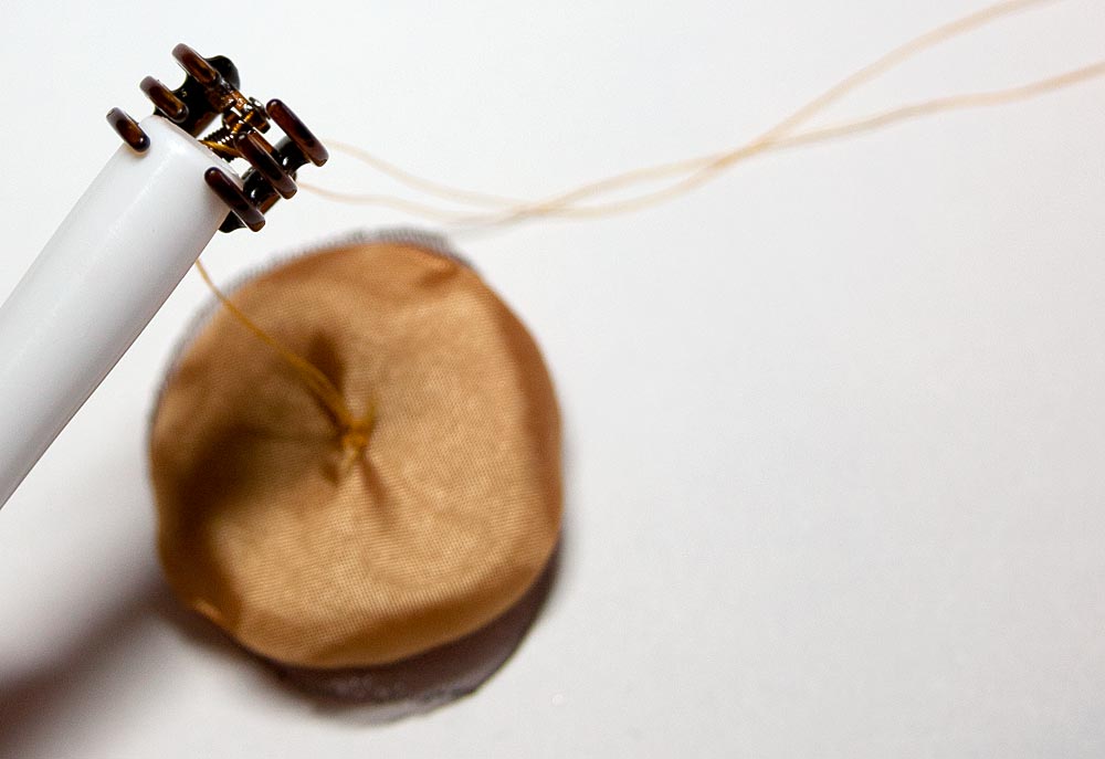 Open the mini claw clip and use a pen cap (or similar) to hold the claw open wide enough that you have easy access to the hinge. If you are a skilled hand sewer, you can simply hold it open. This step also assures the clip will open and close once you are done.