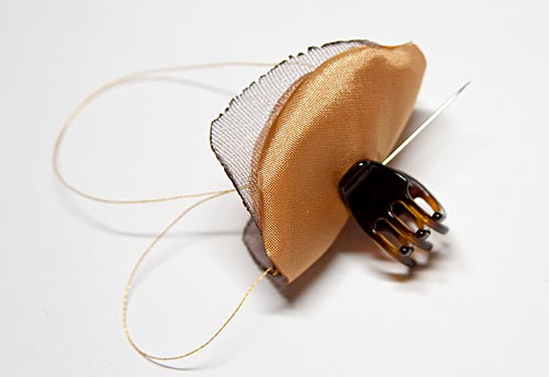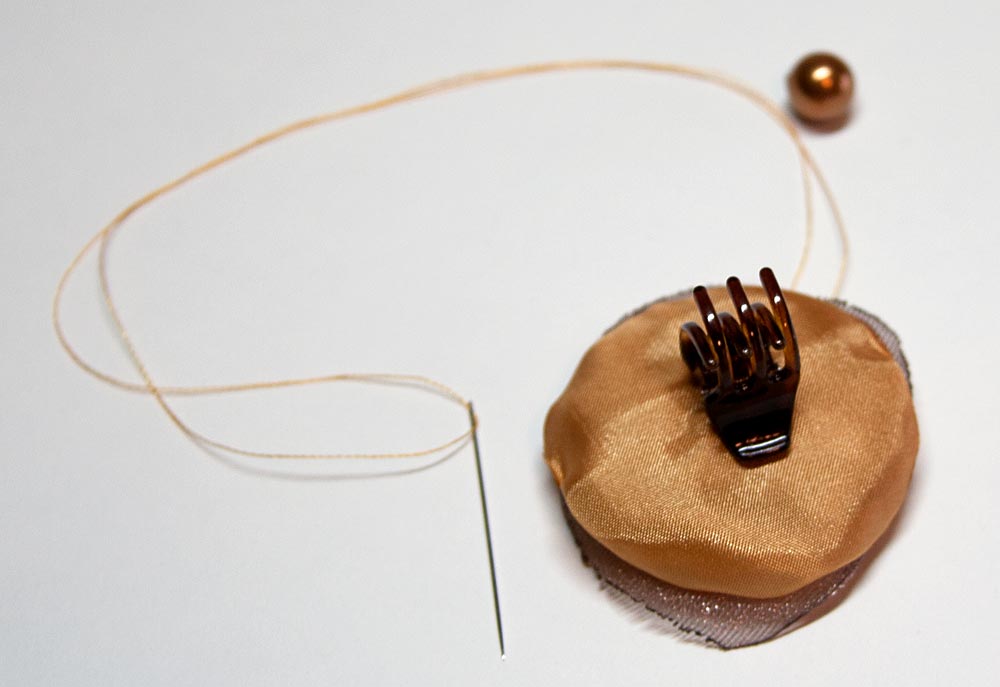 Sew the clip to the flower just like you’re sewing on a button, keeping your stitch smaller than the size of the bead that will cover it. Watch that your thread doesn’t catch on the claws. After going through and back about 6 or 7 times, bring your needle up into the center of the flower.