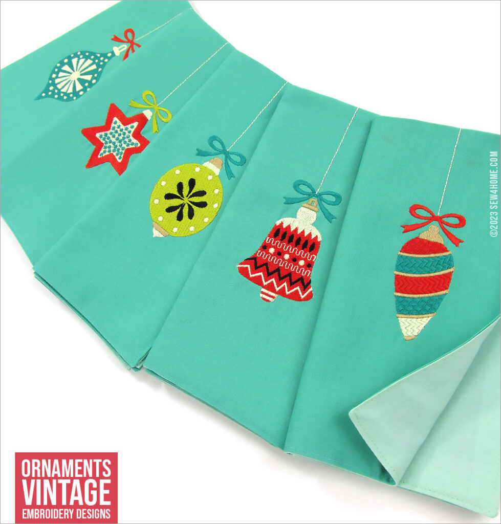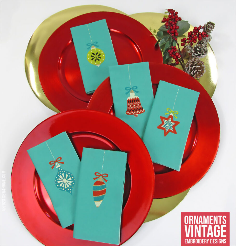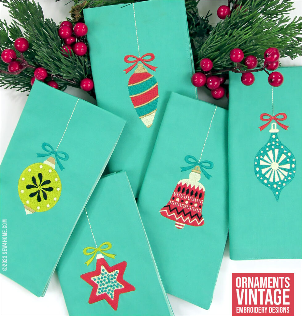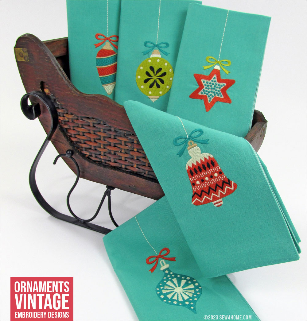 We elected to feature each ornament on an elegant dinner napkin, adding a “hanger” to each embroidery design, using a triple straight stitch. As a special bonus, a step-by-step tutorial is included free with the Designs so you can make this same set of napkins for your holiday gathering – or as a lovely gift idea!