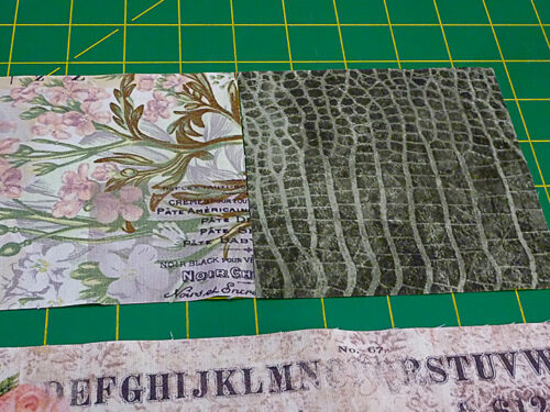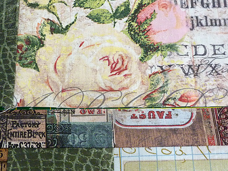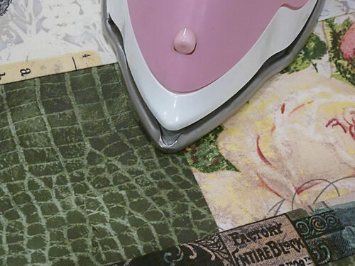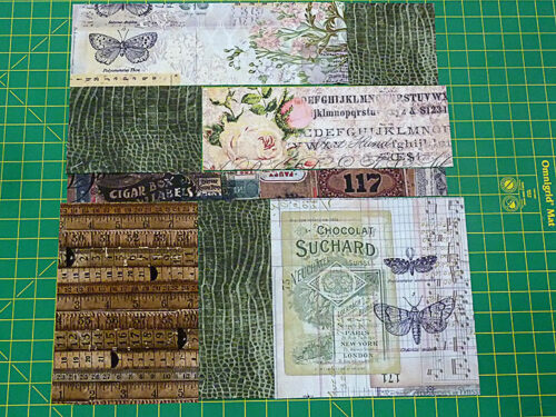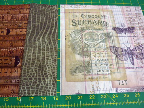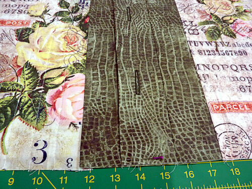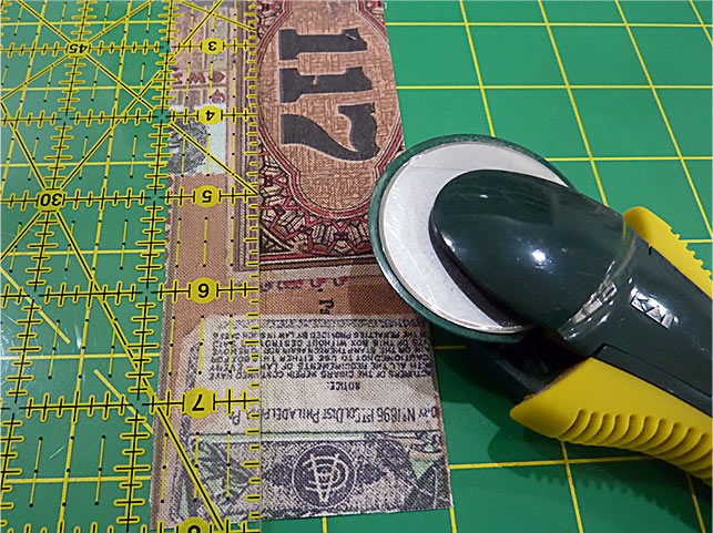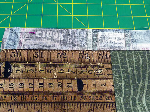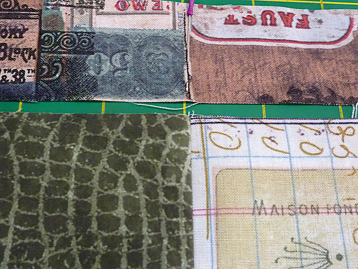 NOTE: For this long, skinny strip, we were extra careful to fussy cut Tim’s collage design so the printed “seams/lines” between the motifs would align with the actual seams of the patchwork grid above and below.