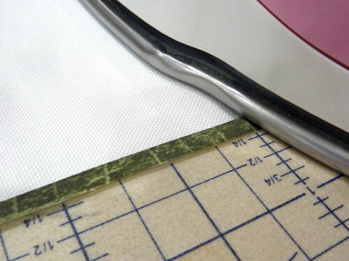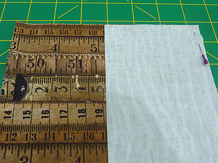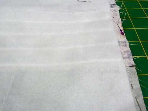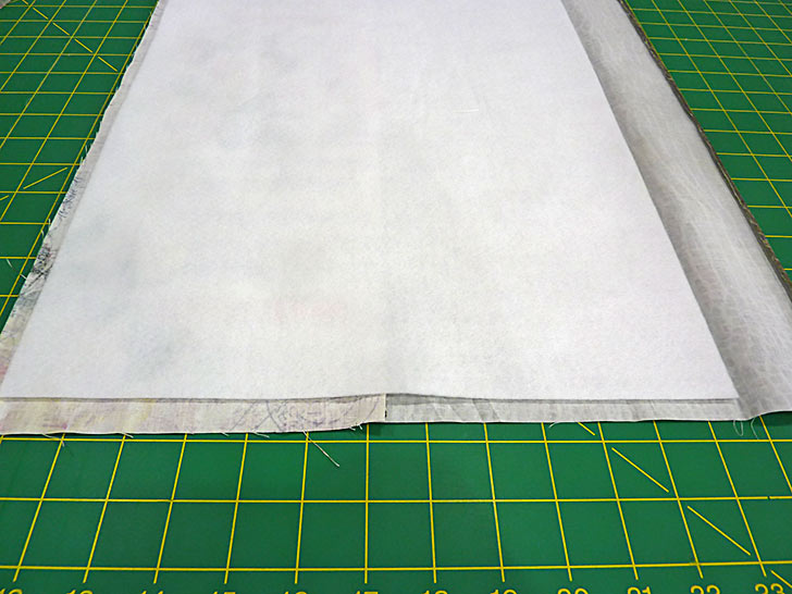 - Place each seamed panel wrong side up on your ironing surface. Unpin/unfold the hem so the crease lines are visible. Find the appropriate panel of fusible fleece (the 10” wide piece is for the overlap, the 11” for the underlap).