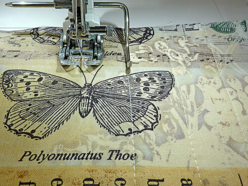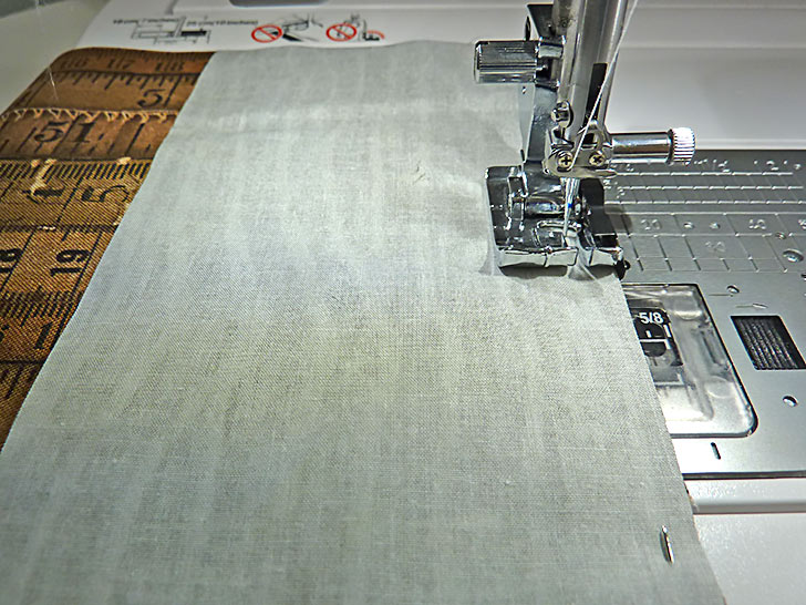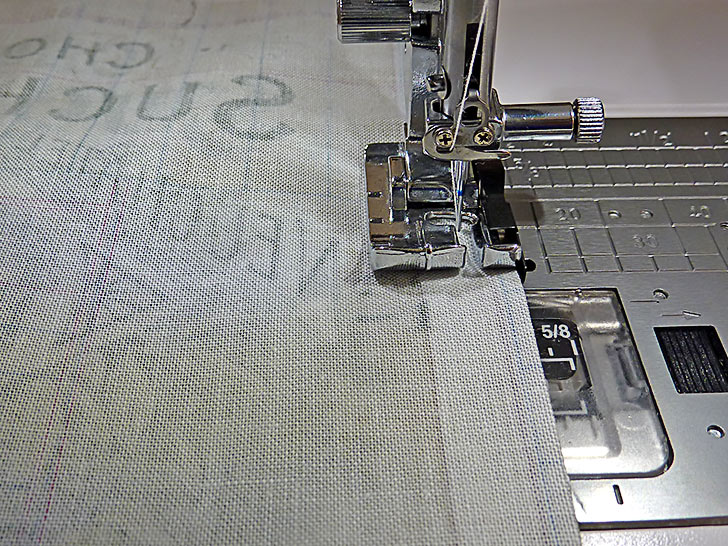 - Attach a Quarter Inch Seam foot. If needed on your machine, adjust settings for both the stitch length and needle position for a ¼” seam allowance. Thread the machine with thread to best match your fabric in the top and bobbin. We used an ecru thread throughout.