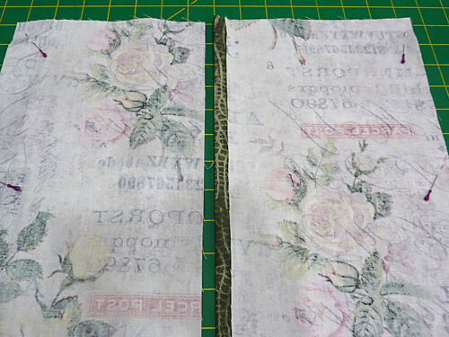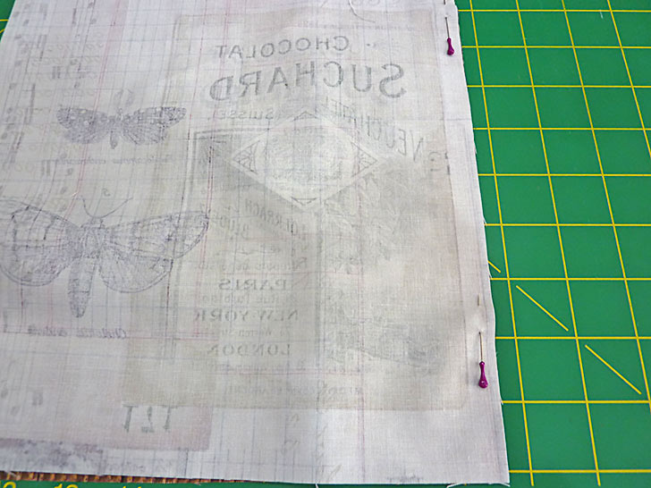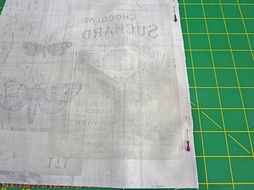 - With both back panels right side up, overlap the two panels (overlap on top, underlap on bottom) until the width of the overlapped panels equals 19”. Pin in place top and bottom. If desired, you could hand or machine baste at the top and bottom for additional security to keep these two panels together through the remainder of construction.