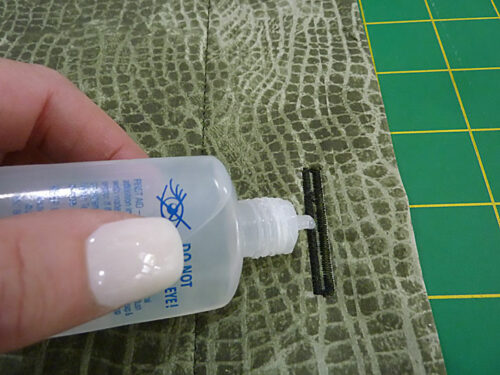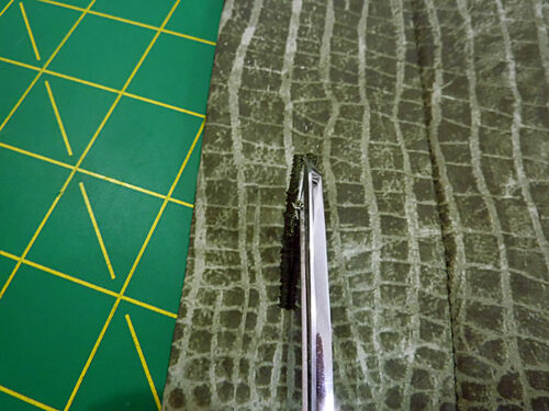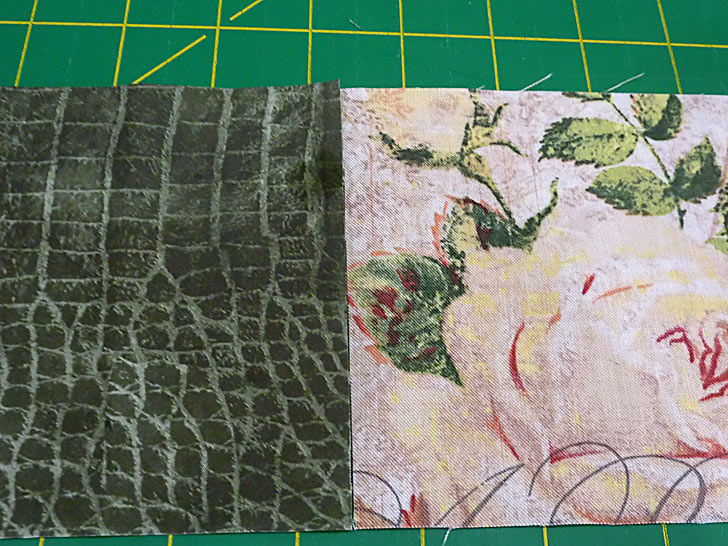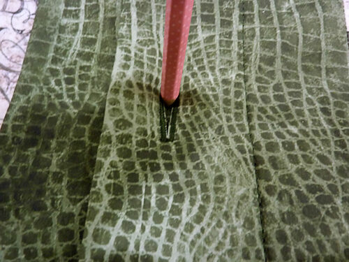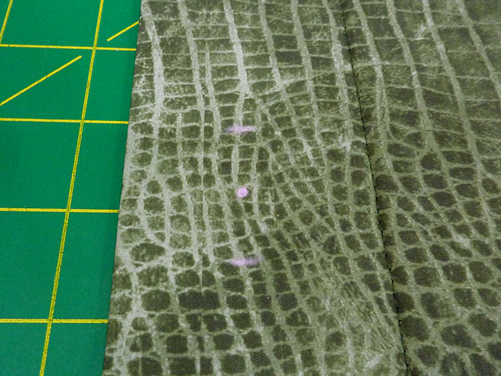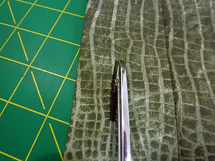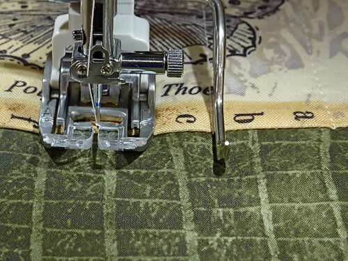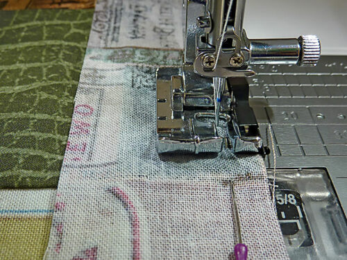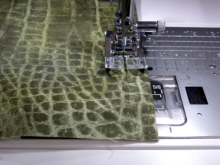 - Re-thread the machine if necessary with thread to best match the overlapping panels in the top and bobbin. We did change out our thread this time to match the dark green of the Worn Croc fabric.