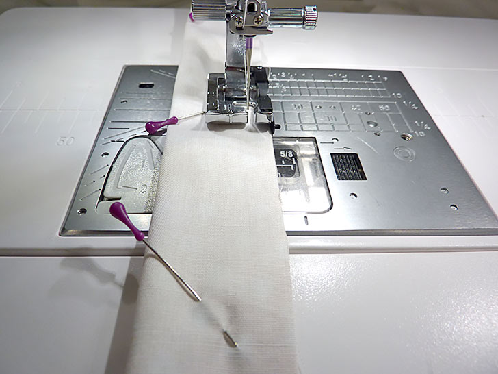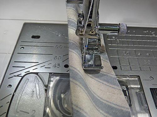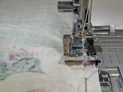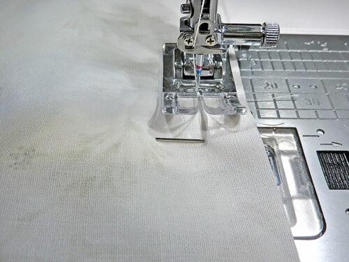 - Re-set for a slightly lengthened stitch and topstitch each hem in place, using the markings on your machine’s throat plate as a guide to run your topstitching seam along the inner fold of each hem.