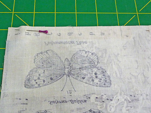 - Find piece 5. It is a row in and of itself. As mentioned above, we were very careful with our fussy cutting to make sure the printed lines within our motif would align with the actual seams of the patchwork rows above and below. In the photo, you can see how the motif marked with the pin aligns with the seam.