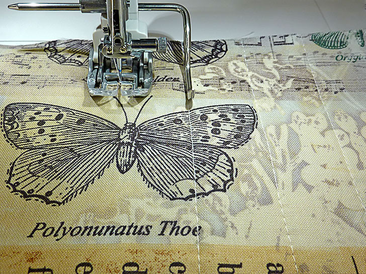 - Re-thread the machine if necessary with thread to best match the fabric in the top and bobbin (we continued to use the same ecru) and re-set for a standard stitch length.
