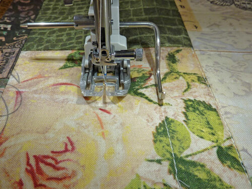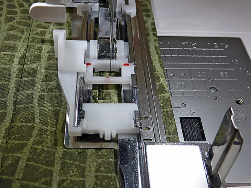 - Attach an Even Feed/Walking foot or engage your machine’s built-in fabric feeding system (this was our choice).