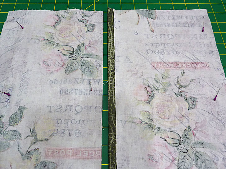 NOTE: IF YOU ARE PLANNING TO USE THE OPTIONAL TIE CLOSURE. THIS IS THE POINT AT WHICH YOU SHOULD STOP TO MAKE AND INSERT THE TIES. SCROLL TO THE BOTTOM OF THE INSTRUCTIONS FOR THESE ALTERNATE STEPS. - Pin a hemmed panel right sides together with each of the #9 pieces. You are pinning the raw edge of the hemmed panel to the inside raw edge of outer panel. As always, make sure any directional motifs are correctly positioned so when the final button overlap is in place everything looks good top to bottom and left to right.