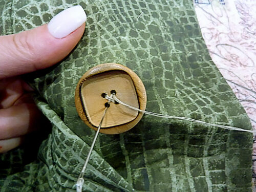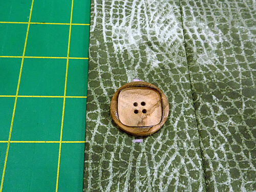 - Thread a hand sewing needle and hand stitch each button in place. We used a decorative “X” stitch for our four-hole buttons.