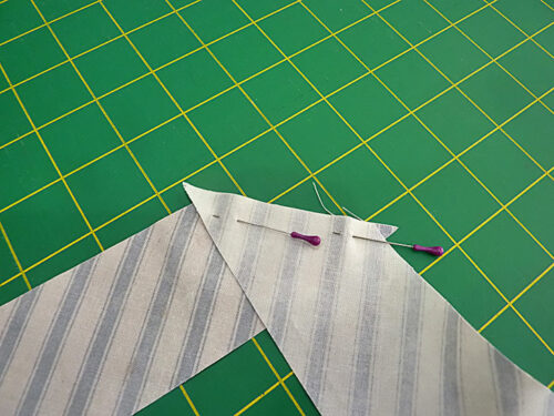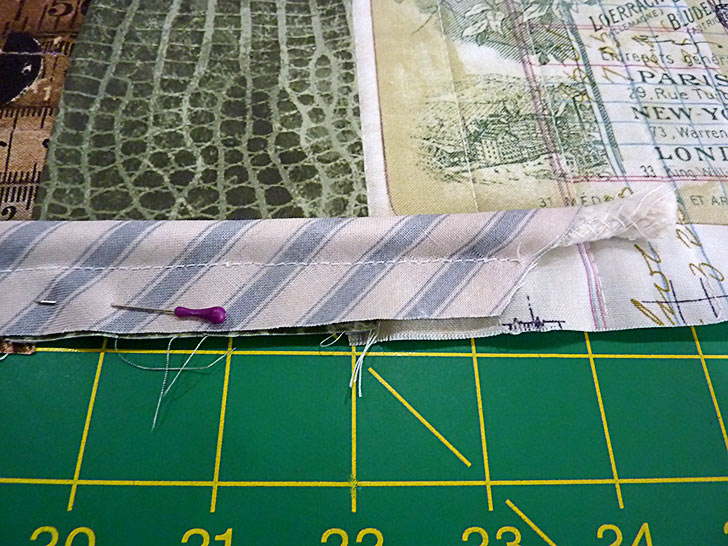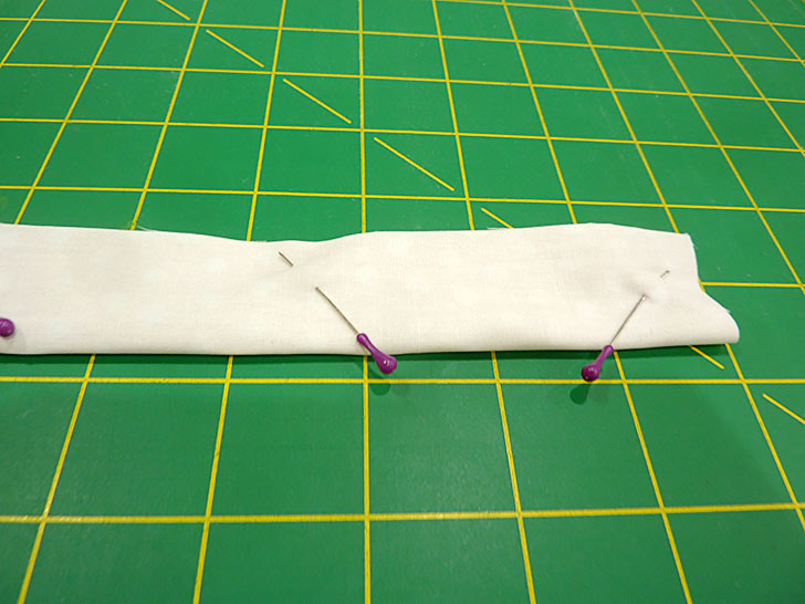 - Fold each tie in half (1¼” x 18″). Pin in place along the side and across one end. The opposite end remains raw.