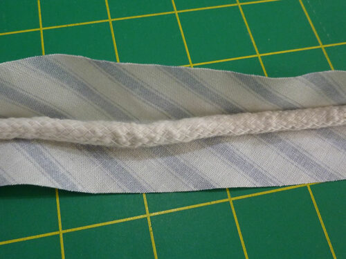 - Place the flattened strip wrong side up on your work surface. Find the 80” length of piping cord. Lay the cord down the center of the strip on the wrong side.