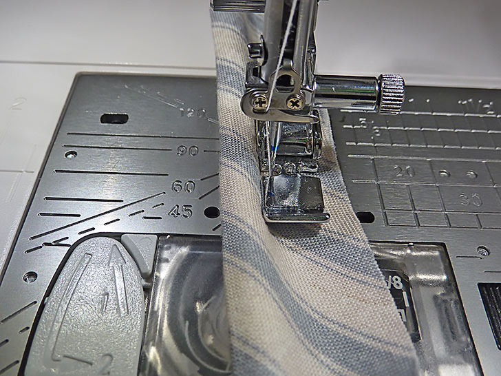- If necessary, re-thread the machine with thread to best match the piping fabric in the top and bobbin. Re-set for a straight stitch. Attach a standard presser foot.