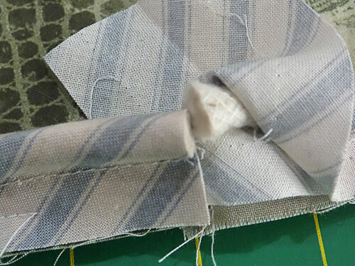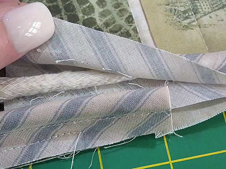 - When you get back to your starting point, lay the piping against the fabric so it is flat and smooth. Slice the head of the cording so that end is straight.