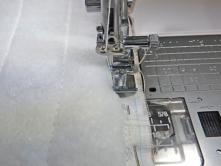 - Once this first line has been stitched, position the foot so the quilt bar runs along the previous line to stitch the next line in the sequence. We stitched the vertical lines first.