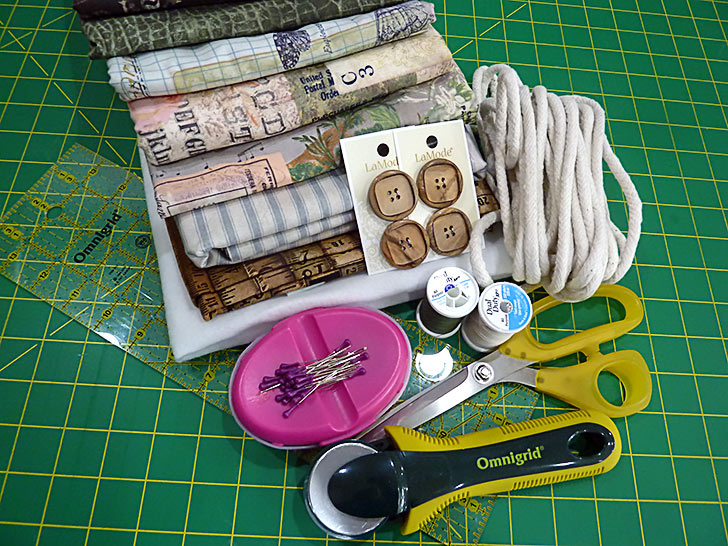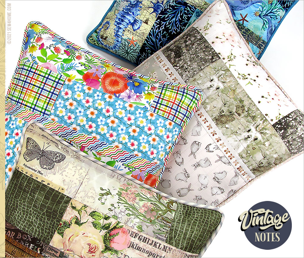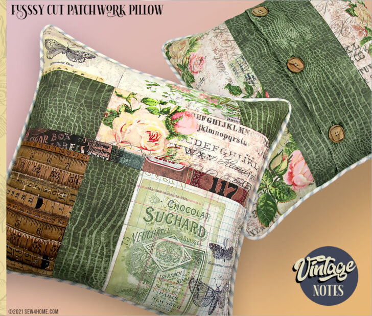 The original sample pillow within the step-by-step instructions below is all about vintage elegance, using six prints from the Tim Holtz Foundations collection for FreeSpirit Fabrics plus one blender from Tim’s Worn Croc collection.