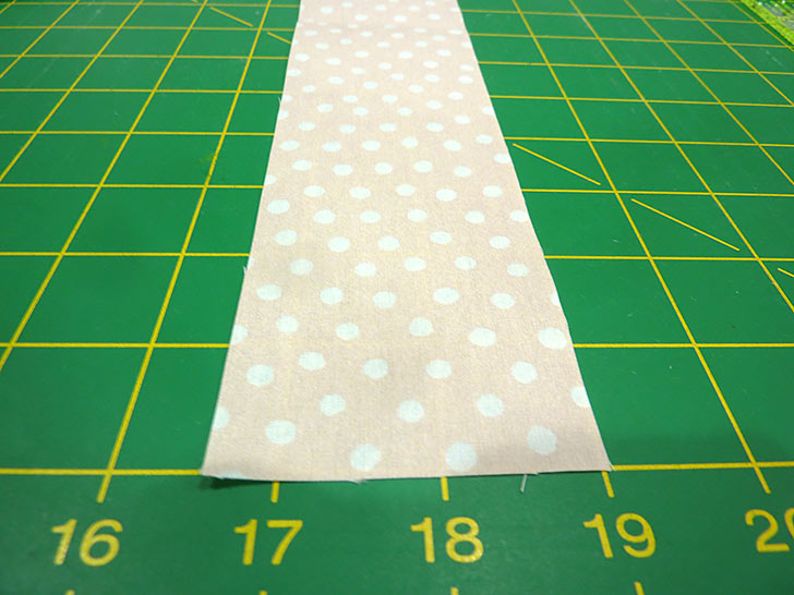 - From your selected tie fabric, cut three 2½” x 36″ strips. We used the You Are Loved pink dot fabric for both the piping and the ties on our sample pillow.