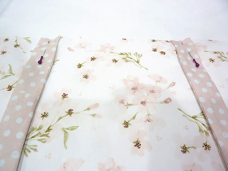 - Find the two hemmed #10 back panels. Pin a hemmed panel right sides together with each of the #9 pieces, sandwiching the ties between the layers. You are pinning the raw edge of the hemmed panel to the inside raw edge of outer panel.