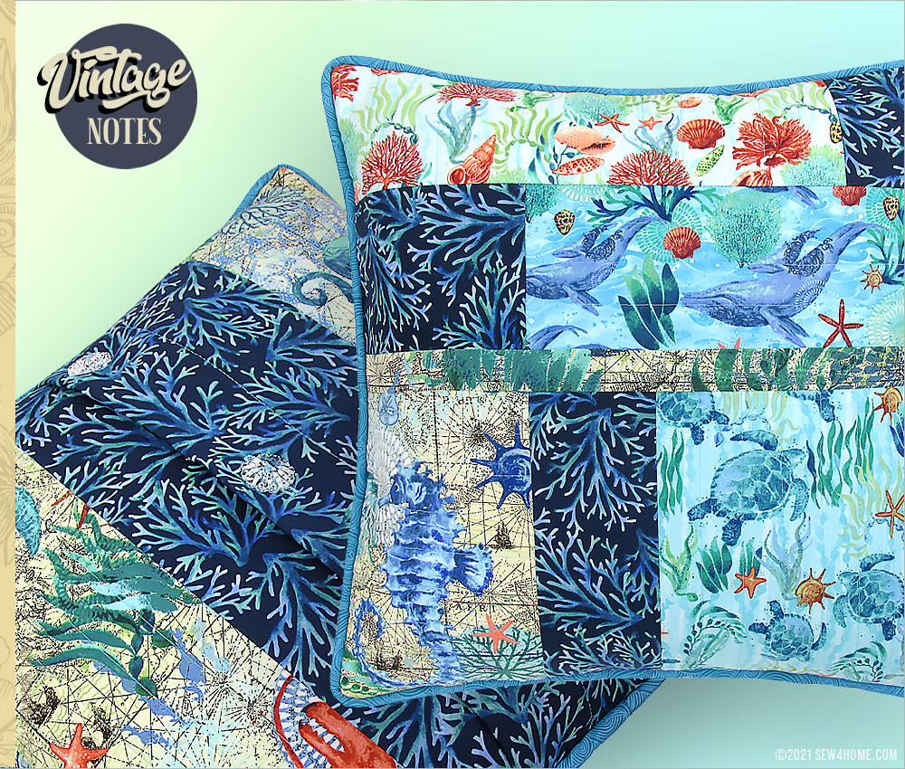 The third sample pillow takes a “deep dive” into gorgeous color and design in five fabrics from the Deep Blue Sea collection by Geoff Allen for Studio E Fabrics plus one blender from Just Color! Basics in Denim for the piping.