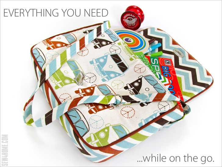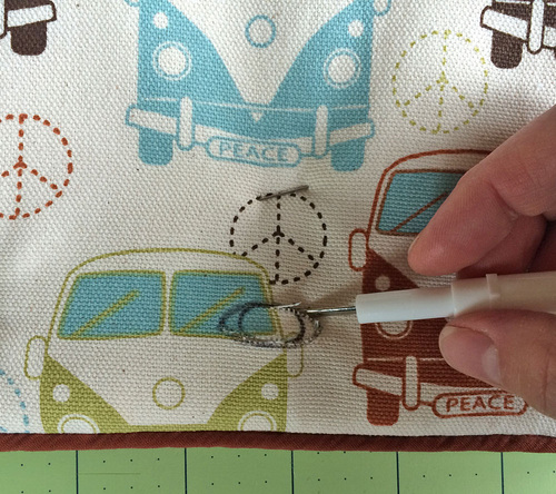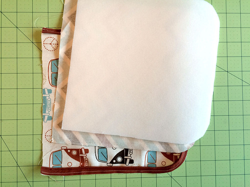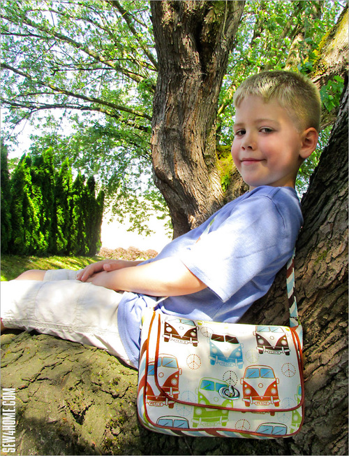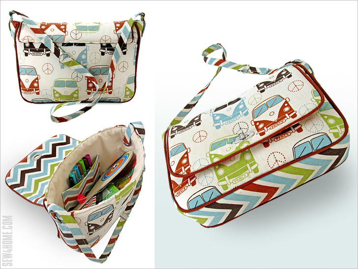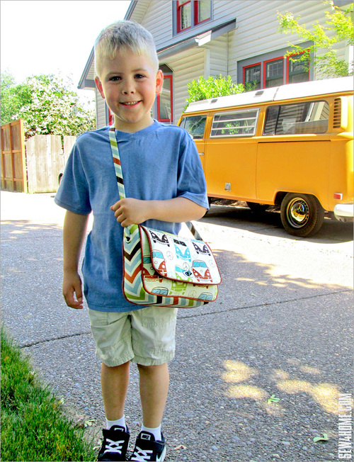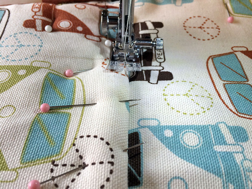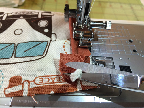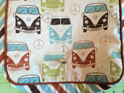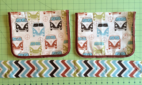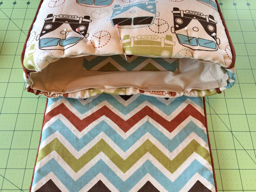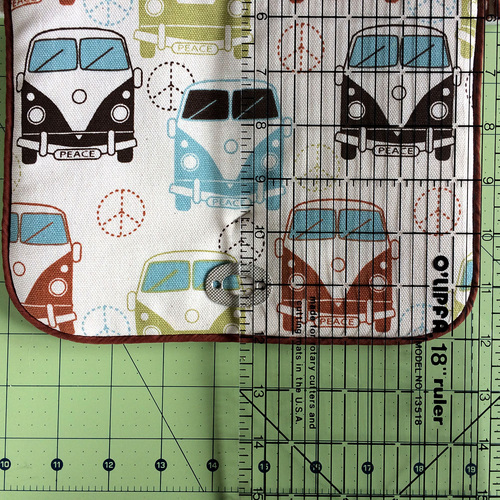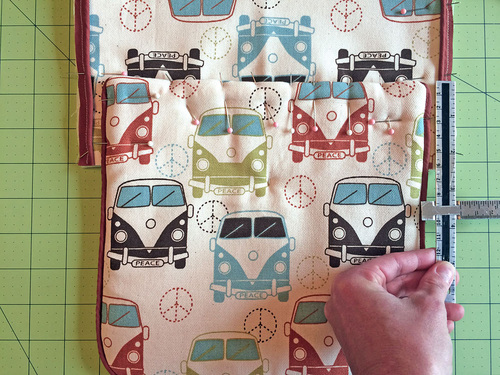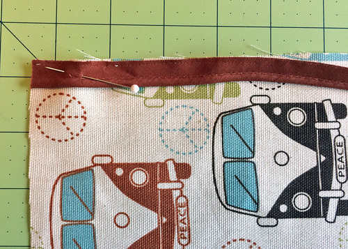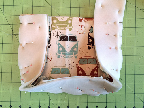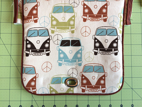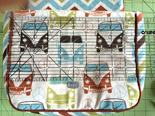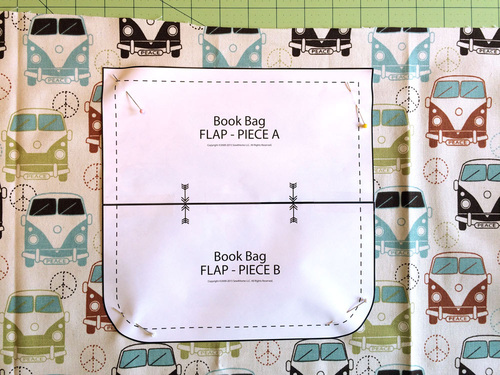 NOTE: We took the time to carefully fussy cut the exterior pieces so the bus motif aligned from the flap to the front of the bag. Photos are included to show our steps. The main thing to keep in mind with your own fabric is that the flap attaches at the back about 2½” down from the top raw edge of the exterior panel.