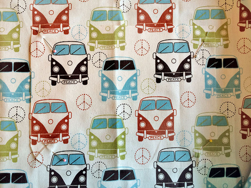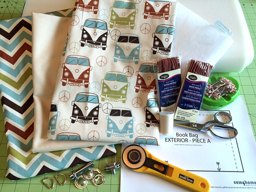 - ½ yard of 44″+ wide medium-weight duck, canvas or similar for the bag and flap exterior; we originally used 54″ 100% cotton duck Love Bus Village in Natural by Premier Prints