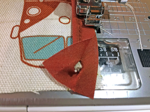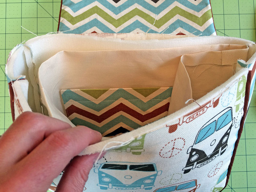 - Clip the curves and turn the flap right side out through the top opening. Push out the corners so they are nicely rounded. A long, blunt tool works great for this, such as a knitting needle, chopstick or point turner. Fold in the raw edges of the top opening so they are flush with the sewn seam and pin closed.