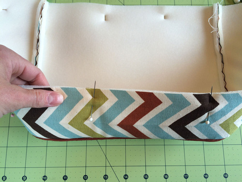 - Pin the piping around the outer edge of both pieces. The top edges remain plain.