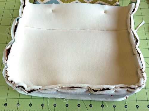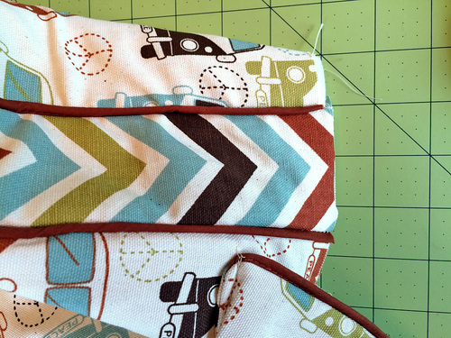 - Layer the three pieces: foam, exterior flap (with the piping in place) right side up, flap lining right side down. Pin in place all around, leaving a 3″ – 4″ gap for turning along the top straight edge.