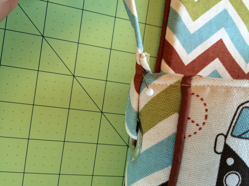 - Repeat to loop one end of the longer strap through the left grommet. If using a directional fabric as we did, insert the proper end so the motif on both straps matches up.
