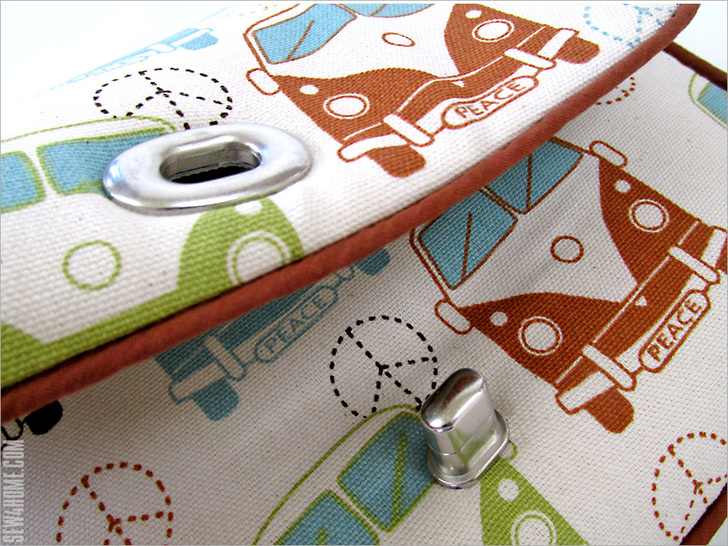 We used a turn lock to secure our flap, and there’s a great Sew4Home tutorial on their installation if you’re new to the technique. You could certainly substitute a simple magnetic clasp or even Velcro® strips, however, don’t discount the cool turn lock closure, because although it looks complex; it’s easier than you might think… check out that tutorial.