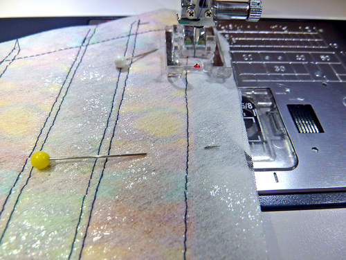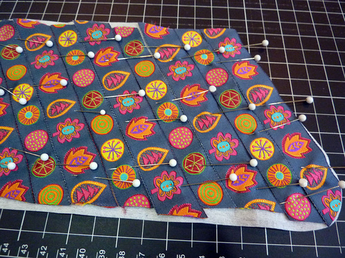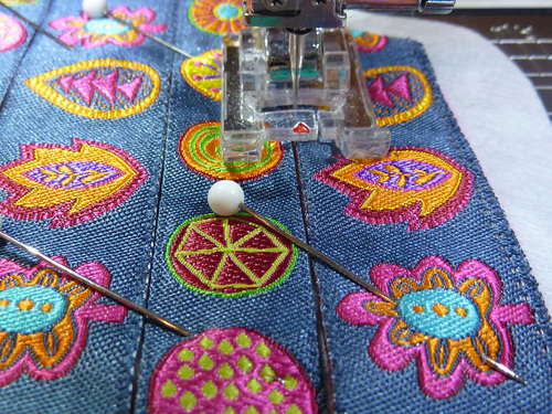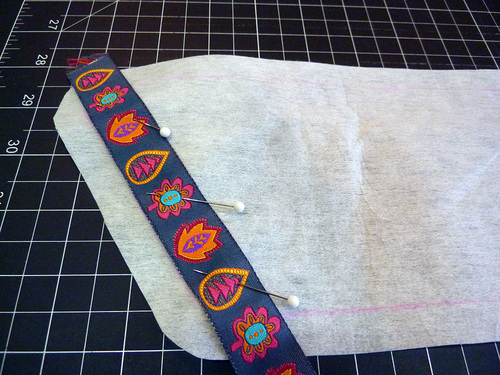 In the photos below, you’ll notice we used pins to hold our ribbons in place. Another option would be to apply a little basting glue or strips of lightweight fusible web, such as Steam-A-Seam or similar to the wrong side of the ribbon. Read and follow the manufacturer’s instructions and test to make sure the ribbon can be easily stitched without the adhesive gumming up the needle. Some adhesives are not meant to be sewn through.