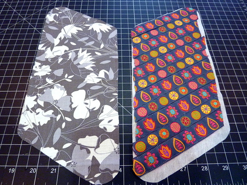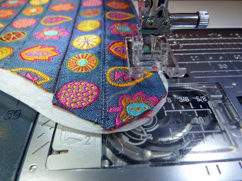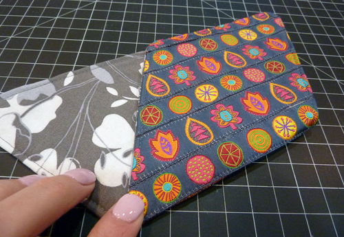 For this multi-layer project with its origami fold, it’s important everything stays flat. Our solution: the ribbons are stitched to the plain side of a layer of fusible interfacing. When the front and back are assembled and pressed, it activates the fusing and creates a tight, smooth bond. Stability is increased and layers are decreased.