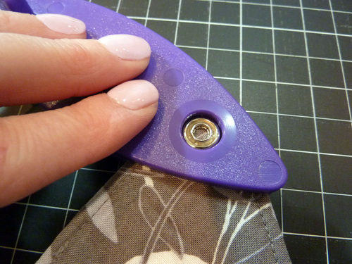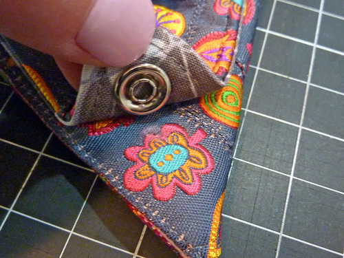 NOTE: Although it focuses on a slightly different tool, we do have a full step-by-step tutorial on inserting snaps. The process is slightly different than shown here, but the theory and the snap parts themselves are similar. If you are brand new to inserting snaps, you may find it helpful. - Re-fold the piece all the way into its finished triangle shape again to confirm the position for the bottom half of the snap. Mark the position with a fabric pen or pencil.