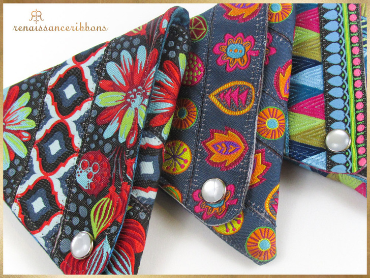 When we’re working with the eye-popping ribbons options within the Renaissance Ribbons collections, the hardest part is narrowing our choices – we want to pick them all! We originally settled on creating three samples, using ribbon pairings from Amy Butler, Sue Spargo and Tula Pink. There are so many other possible combos to build your own unique look.