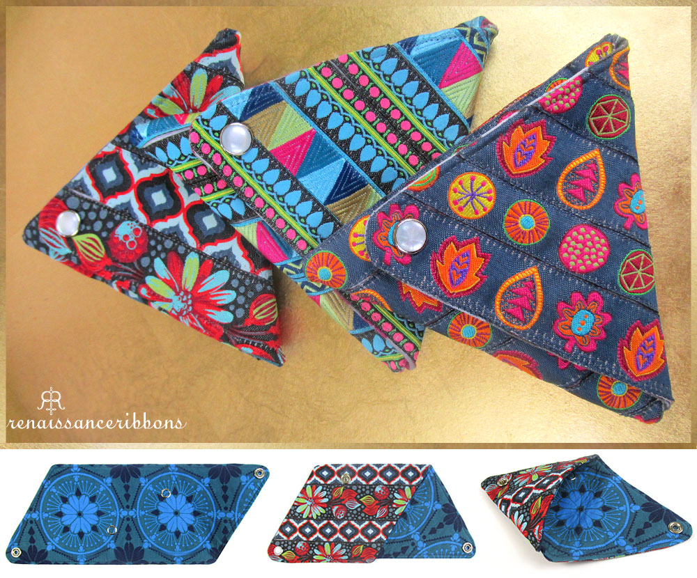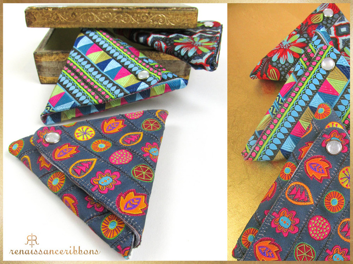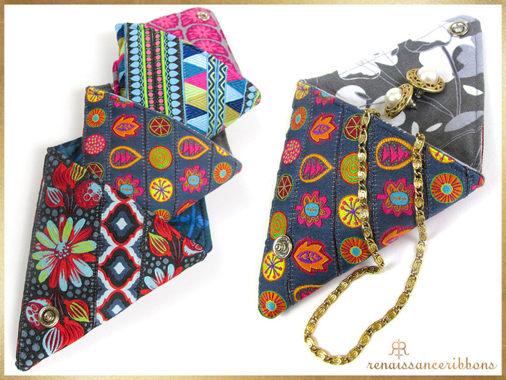 It starts flat, then folds up 1-2-3, and snaps front and back to create an adorable cone-shaped mini purse for coins and more. Project design credit goes to Tendance Ruban for re-inventing this lovely vintage design; our thanks to Renaissance Ribbons for bringing it to our attention and suggesting we do an update, with their gorgeous ribbons, of course! We reverse-engineered the original sample to provide you with easy, step-by-step instructions and a downloadable pattern.