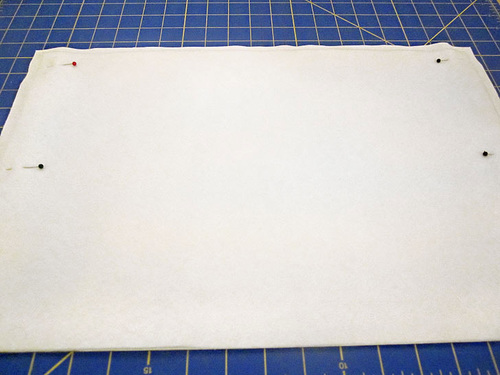 - Place the fusible fleece on the wrong side of the front, back, and side exterior panels. It should sit so there is ½” of fabric showing beyond the fleece on the sides and along the bottom. Along the top, the fabric and fleece should be flush. Lightly pin in place.