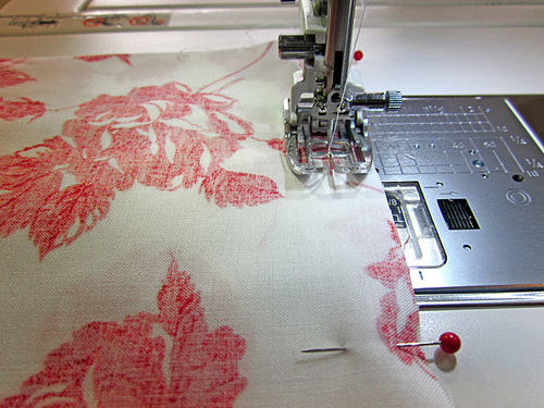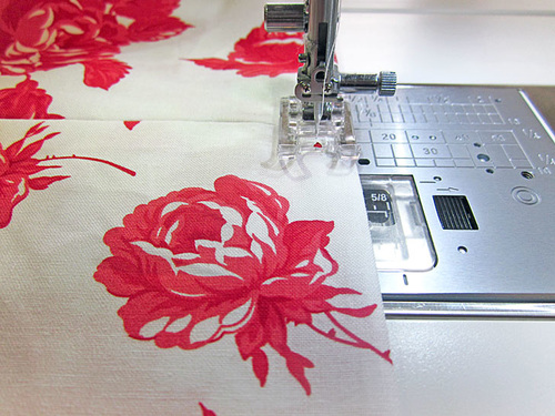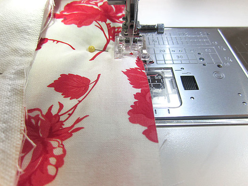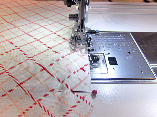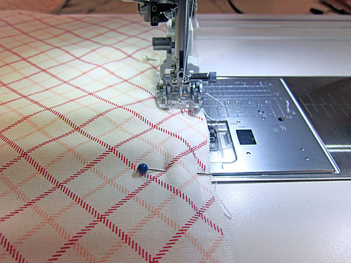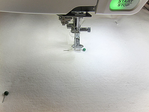 - Using the outer pin point as your guide, start your seam ½” in and stitch across to the opposite outer pin. You are using a ½” seam allowance. You are stitching right along but no one the foam.